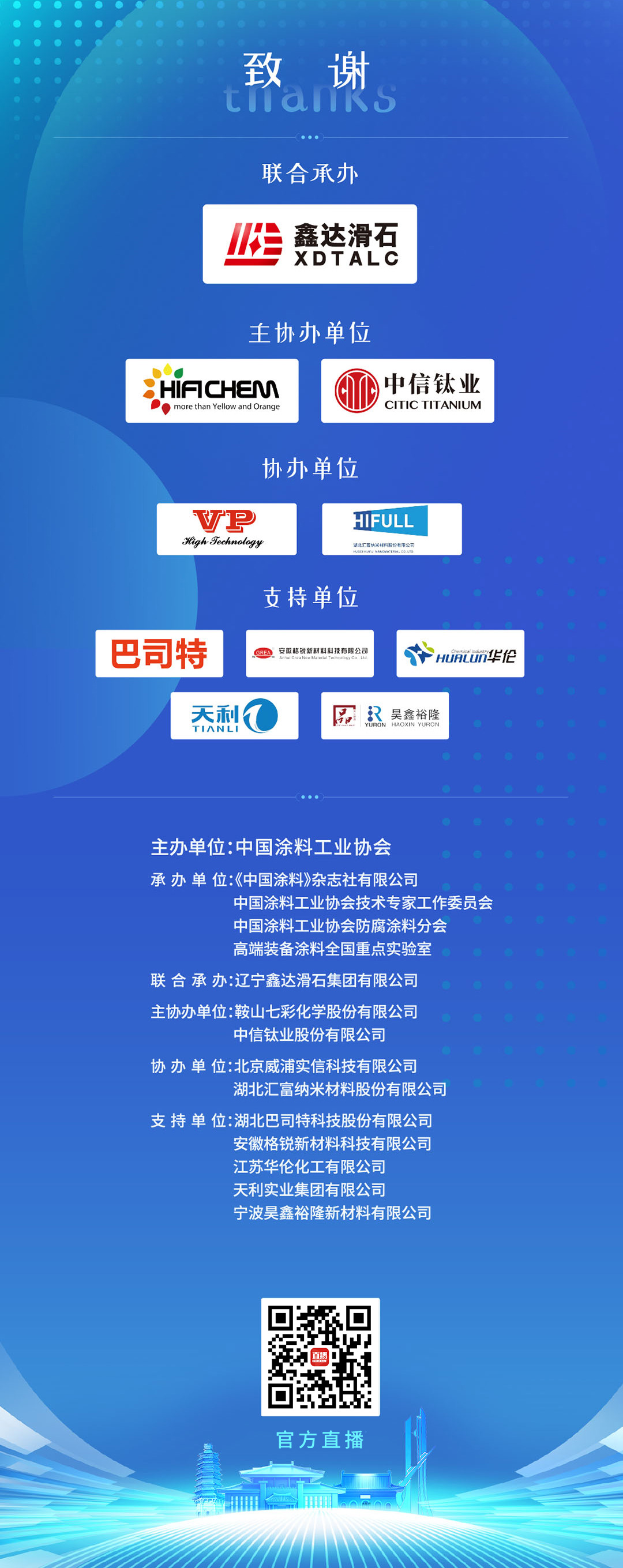 特別感謝聯(lián)合承辦單位遼寧鑫達(dá)滑石集團(tuán)有限公司,主協(xié)辦單位鞍山七彩化學(xué)股份有限公司、中信鈦業(yè)股份有限公司,協(xié)辦單位北京威浦實(shí)信科技有限公司、湖北匯富納米材料股份有限公司,支持單位湖北巴司特科技股份有限公司、安徽格銳新材料科技有限公司、江蘇華倫化工有限公司、沈陽(yáng)天利實(shí)業(yè)集團(tuán)有限公司、寧波昊鑫裕隆新材料有限公司對(duì)本次會(huì)議的大力支持。